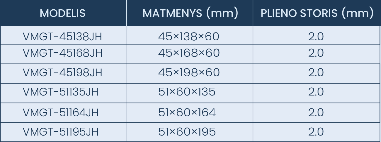 • Skylių pozicijų tolerancija: ±1 mm (pagal ISO 2768 C)